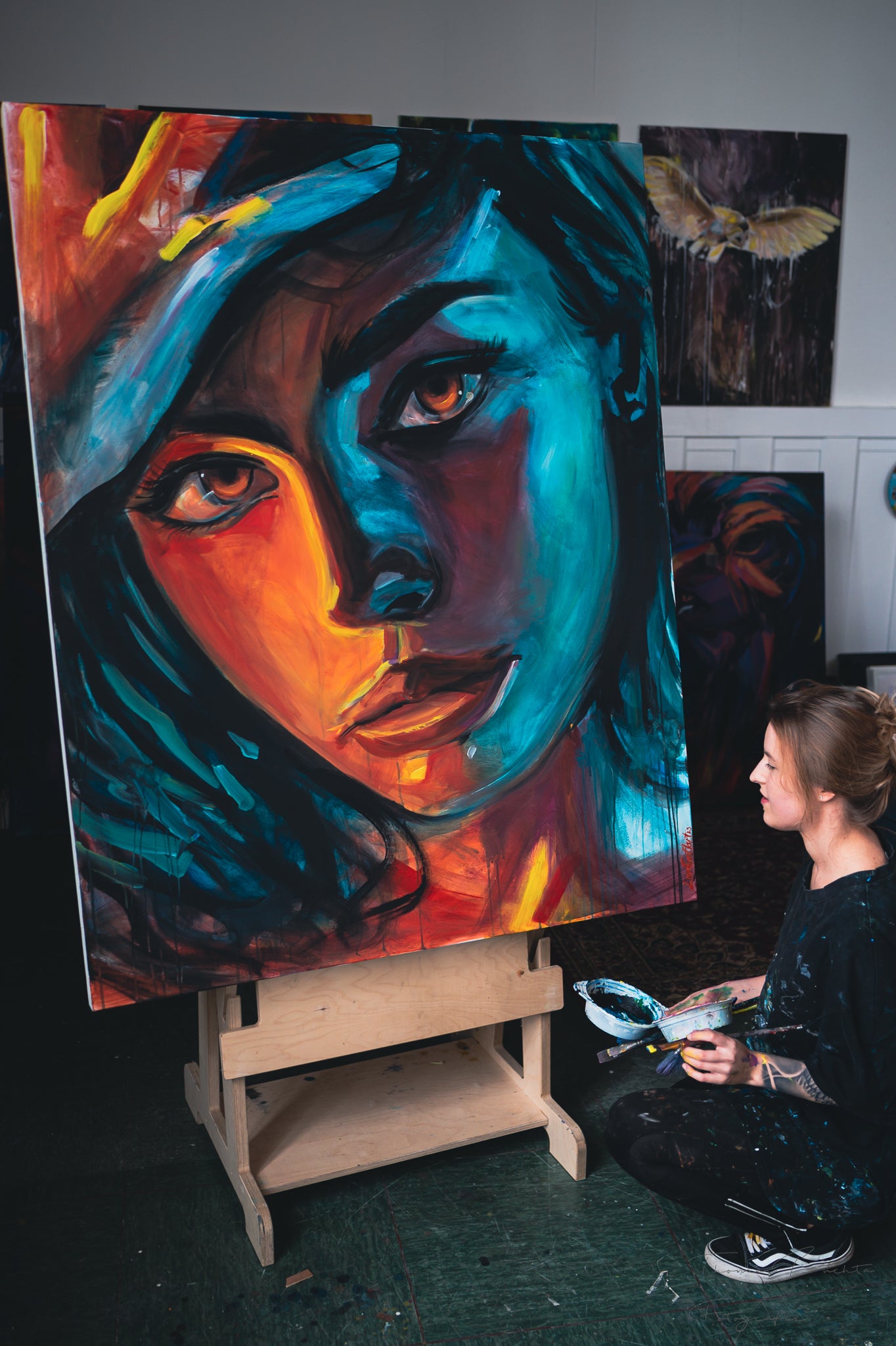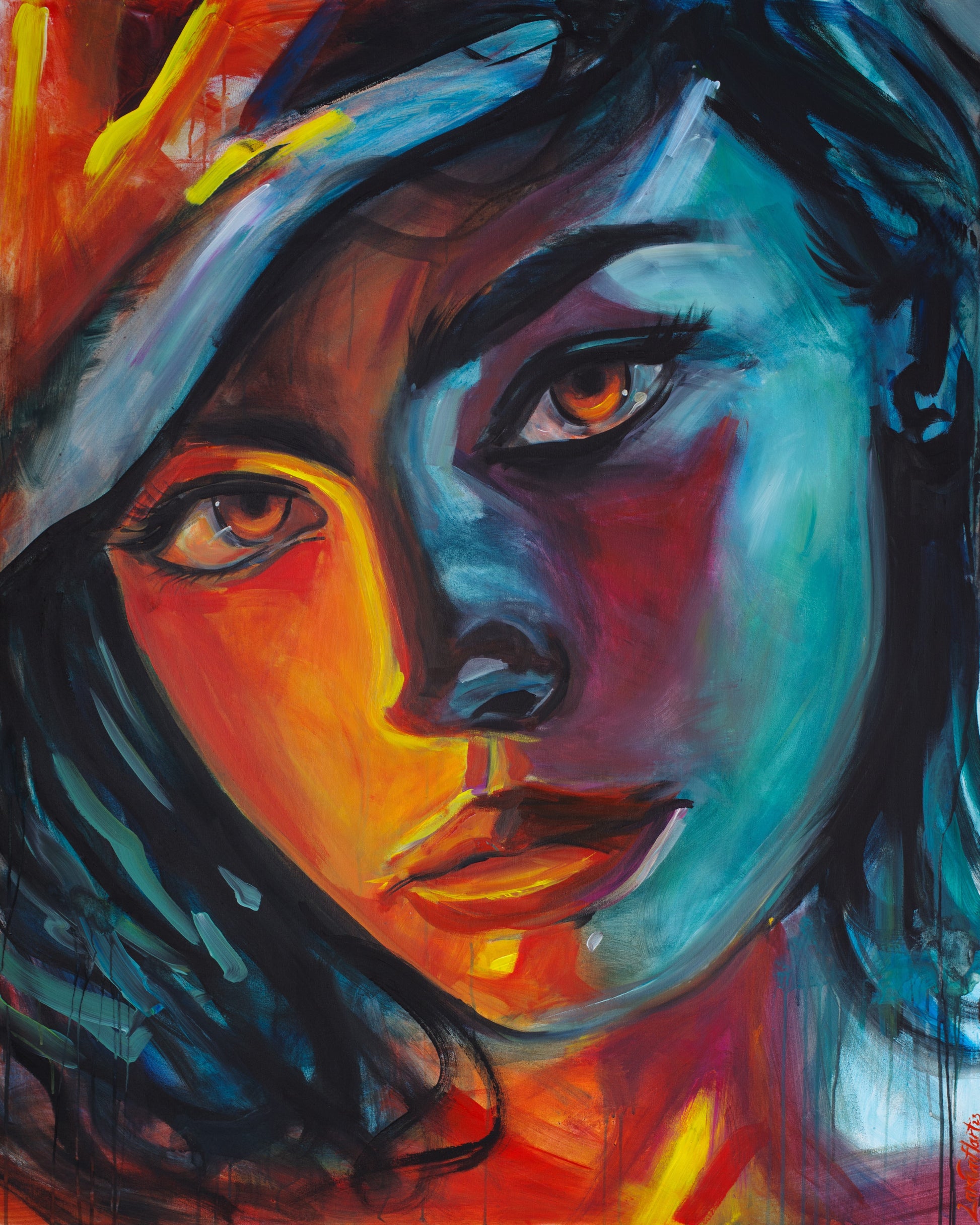 Das Gemälde zeigt das Gesicht einer Frau, das im Wechselspiel von Licht und Schatten zu leben scheint. Helle Partien und dunkle Flächen greifen ineinander und spiegeln die Licht- und Schattenseiten ihres Lebens wider. Das Licht legt ihre Stärke, Hoffnung und Offenheit frei, während die Schatten von Schmerz, Tiefe und vergangenen Kämpfen erzählen. In ihren Augen liegt eine pure Leidenschaft, die den Betrachter unmittelbar fesselt. Gleichzeitig durchzieht sie eine fast greifbare Elektrizität, als würde ihre innere Energie aus der Leinwand herausstrahlen.