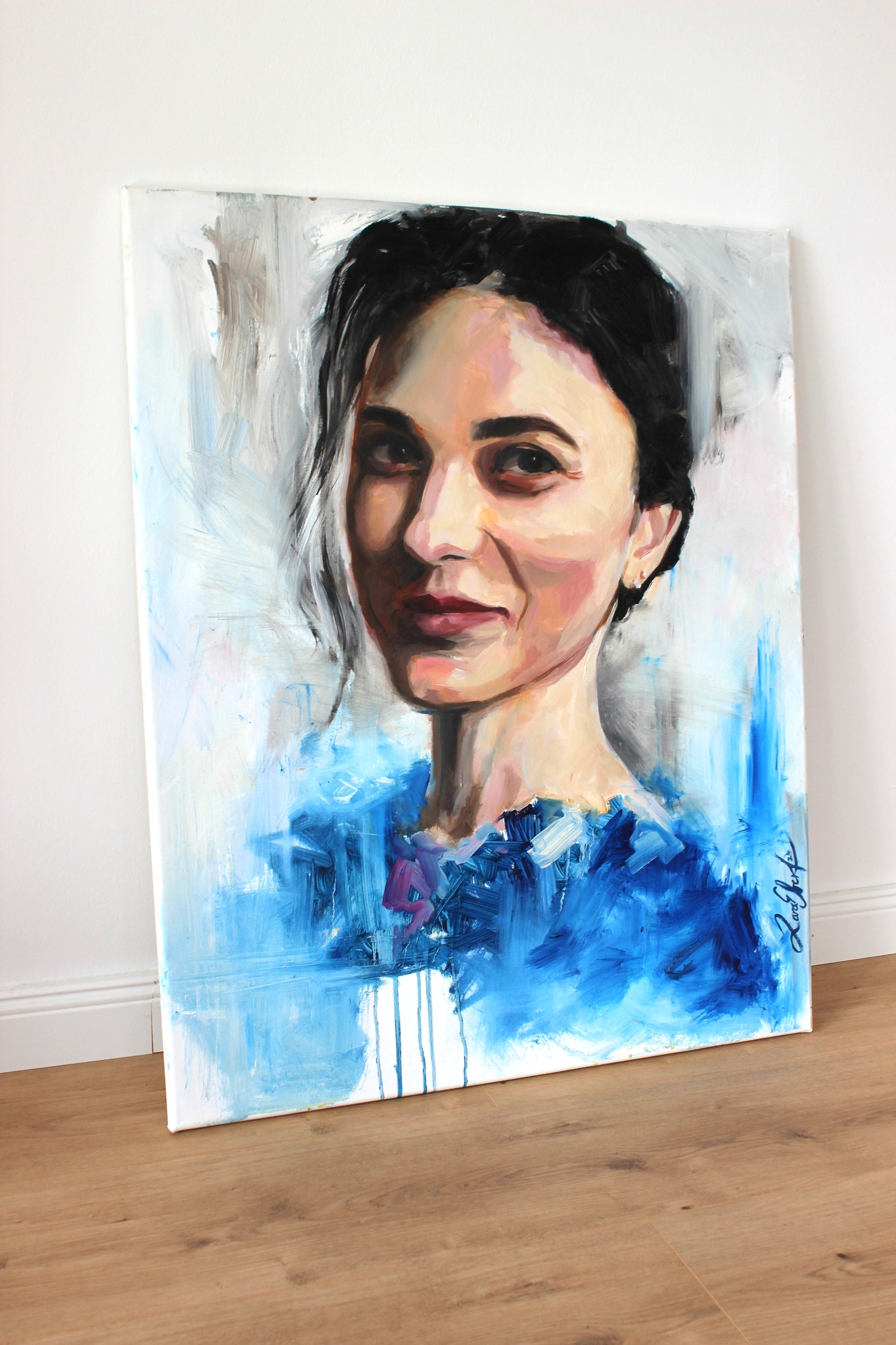 Die geheimnisvolle Künstlerin mit dem königlichen Blick in tiefem Blau. Ihr Gesicht wirkt ruhig, doch in ihren Augen funkelt eine alte, stille Kraft. Der Blick durchdringt den Betrachter, als würde sie deine Wahrheit sehen, bevor du sie selbst erkennst. Ihr blaues Kleid fließt wie Wasser, verbunden mit Himmel und Seele zugleich. Feine Lichtreflexe umspielen ihr Antlitz – wie ein Zeichen, dass sie mehr sieht als die Welt erlaubt. Sie ruht in sich, als wäre sie eine Brücke zwischen Natur, Kunst und innerem Wissen. Man kann sich ihrem Blick kaum entziehen – er spricht in Rätseln, die man gern lösen möchte. Dieses Bild lädt nicht nur zum Staunen ein, sondern erinnert daran, selbst königlich und echt zu sein.