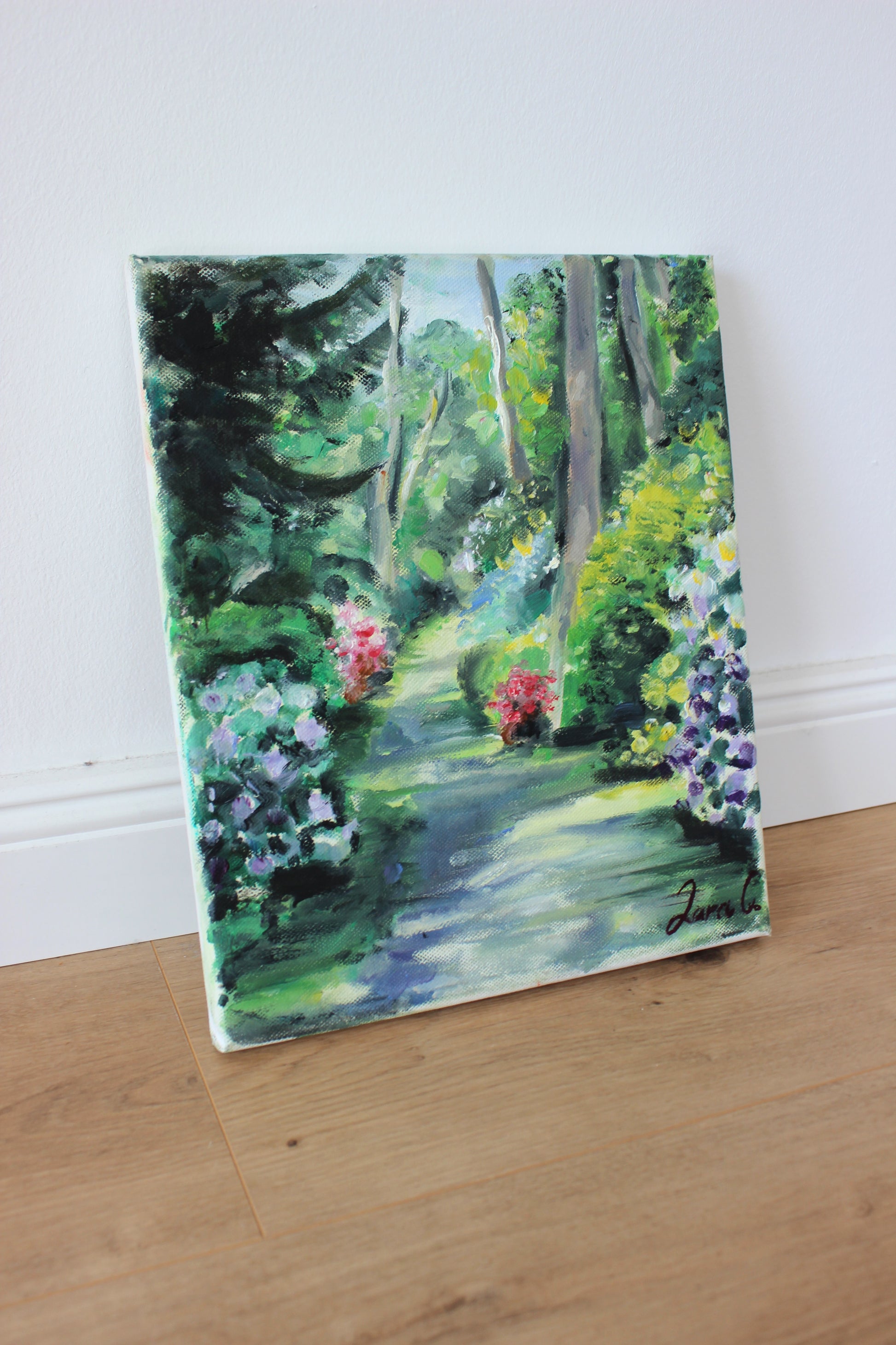 Das kleine Gemälde „Waldspaziergang“ fängt den Zauber eines Frühlingsmorgens ein, an dem das Leben neu erwacht. Sanft fällt das Licht von der Seite durch das frische Blätterdach und tanzt auf dem weichen Waldboden. Zarte Blüten in Rosa, Weiß und Lila säumen den Pfad, als wolle die Natur selbst dich willkommen heißen. Die Luft ist klar, voller Duft von Moos, Holz und jungem Grün – jeder Atemzug fühlt sich wie neue Kraft an. Ein leiser Wind bewegt die Zweige, flüstert Hoffnung in deine Gedanken. Es ist einer dieser Tage, an dem dein Herz leichter wird, ohne dass du es merkst. Der Wald umarmt dich mit seiner Ruhe, seinem Leben, seinem stillen Lächeln. „Waldspaziergang“ erinnert daran: Die Schönheit ist immer da – du musst sie nur wieder sehen.